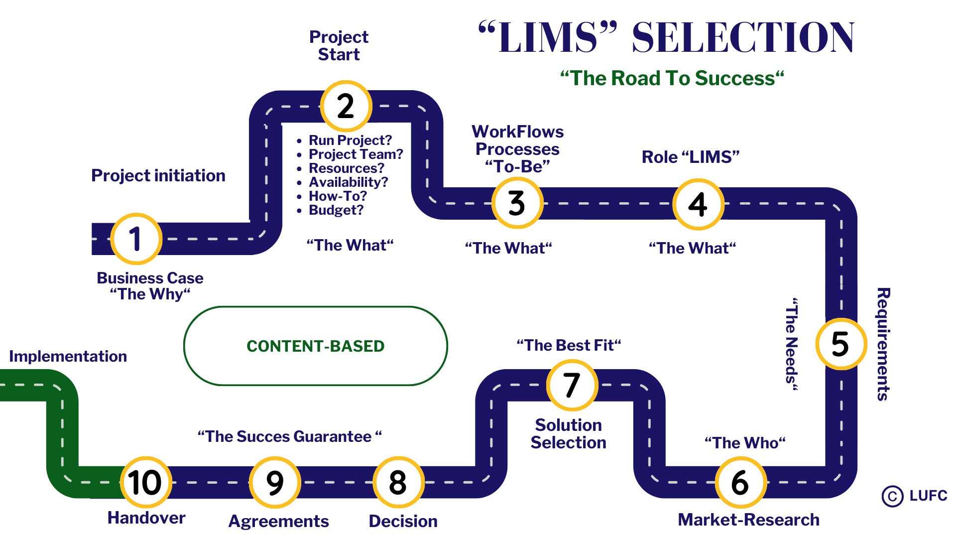 Only few laboratories have the expert knowledge to successfully plan and execute a complex LIMS selection and implementation project. It is essential to setup a multistep selection procedure with the proper selection criteria after each step. Furthermore you need to gain the skills to stay in control of the project to avoid that vendors take control and steer the project towards their own solution.