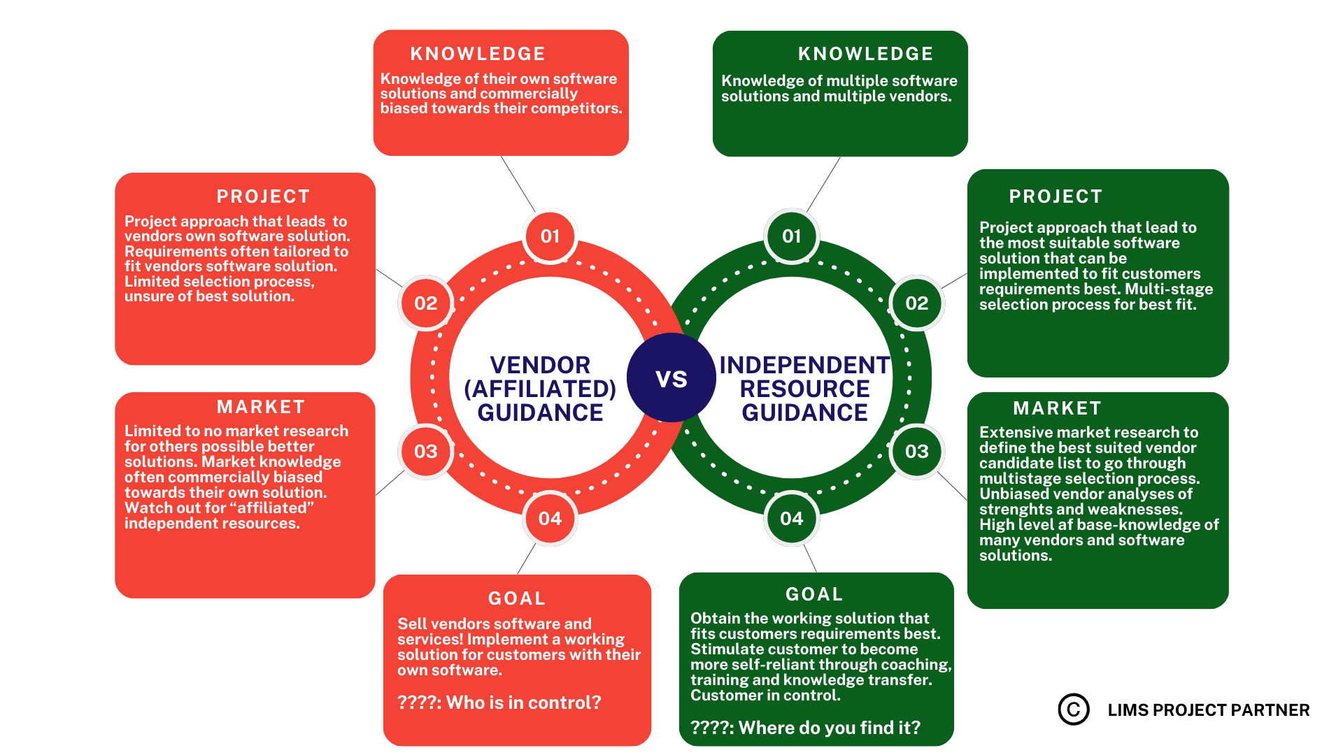LIMS Project Partner is positioned between laboratory customer and vendors, providing project knowledge & experience to the laboratories and providing neutral guidance to vendors to be able to present their offering best suiting the interests of both vendor and customer.