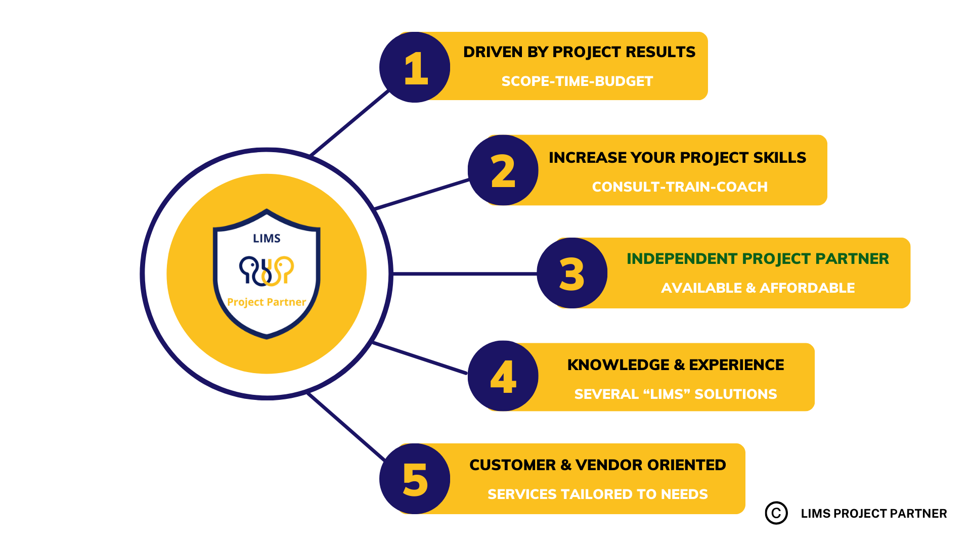 LIMS Project Partner's consultant/coach does not take over the role of the vendor-consultant or project manager. The consultant/coach will operate from a steering-role between customer and vendor.